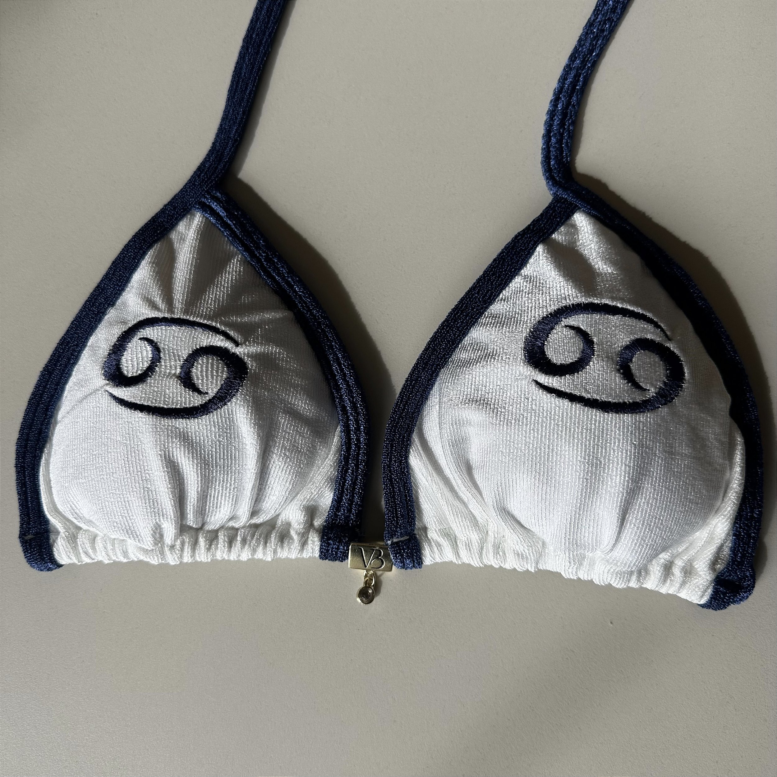 Cortininha 018 com bojo removível off white e detalhes marinho com bordado signo câncer