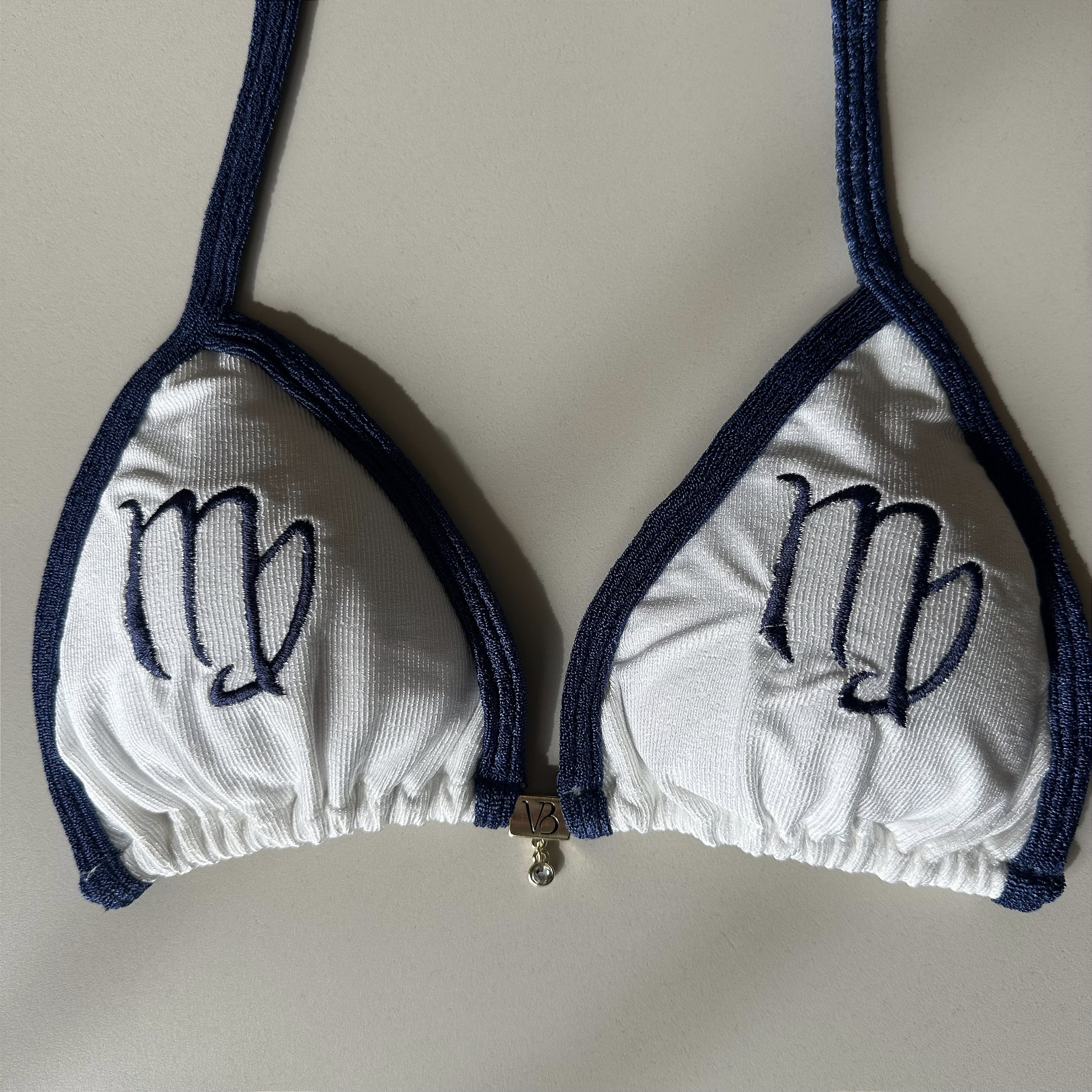 Cortininha 018 com bojo removível off white e detalhes marinho com bordado signo Virgem