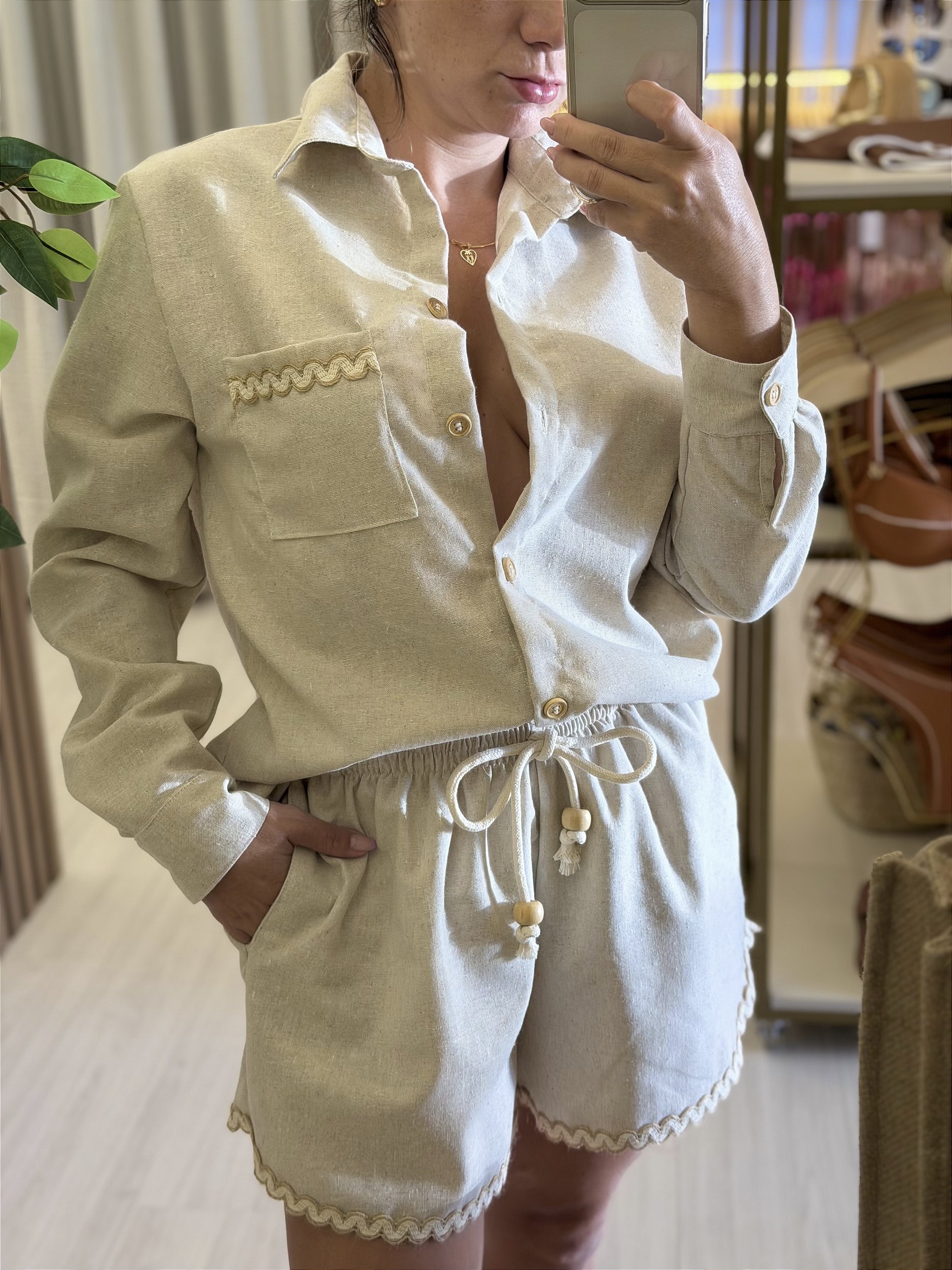 A camisa de modelagem soltinha possui bolso funcional, podendo ser usada aberta ou fechada. O short com caimento fluido também conta com bolso, além de um cordão charmoso com detalhe em madeira, que traz um toque único e especial à peça. O cós é confortável, perfeito para composições versáteis.